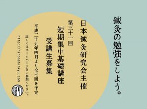 第31回 短期集中基礎講座のご案内 2017 3/14 短期集中講座 | 講座報告 2017年3月2日2017年3月14日2017年度「短期集中基礎講座」への参加者を募集しています。参加される方は、参加申込みフォームよりご連絡お願いいたします。 短期集中講座 | 講座報告 よかったらシェアしてね! URLをコピーしました! URLをコピーしました! 鍼の会雑誌 第20号刊行 鍼の会雑誌 第21号刊行 この記事を書いた人 nihonshinkyu 関連記事 短期集中基礎講座(京都講座)2019年11月補講の報告 2019年11月3日 短期集中基礎講座(京都講座)5月 2017年5月7日 平成28年度(第30回)短期集中基礎講座が終了いたしました 2016年10月2日 第24回短期集中講座の会場案内 2016年9月24日